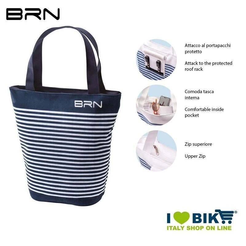 Borsa singola a righe, con gancio per laterale al portapacco protetto. La borsa è munita di manici per trasportarla a mano, dopo averla rimossa dal portapacchi ed utilizzarla come borsa normale, la zip superiore assicura il contenuto all’interno.