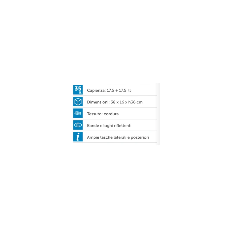 - In cordura imbottita dotate di tasche laterali e posteriori molto ampie.